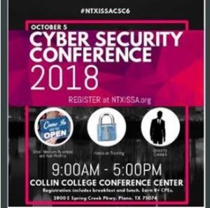 The 6th annual NTXISSA Cyber Security Conference brings together some of the brightest minds in the industry and it is a place where one can connect, share, be inspired, create opportunities and grow. This event is co-sponsored by The Collin College Engineering Department, Collin College Student Chapter of the North Texas ISSA.